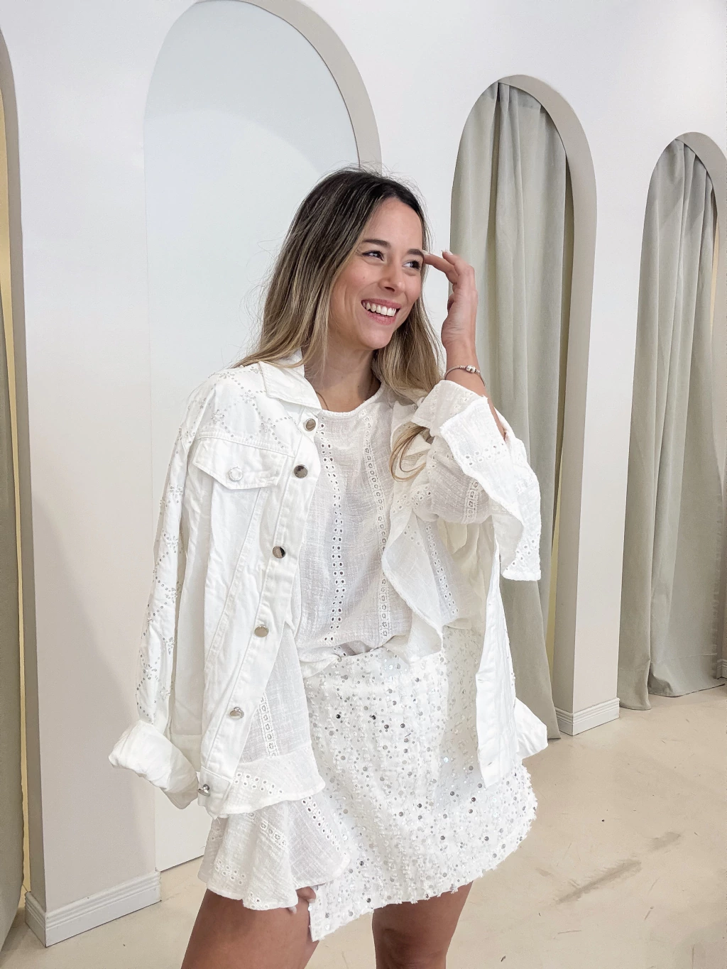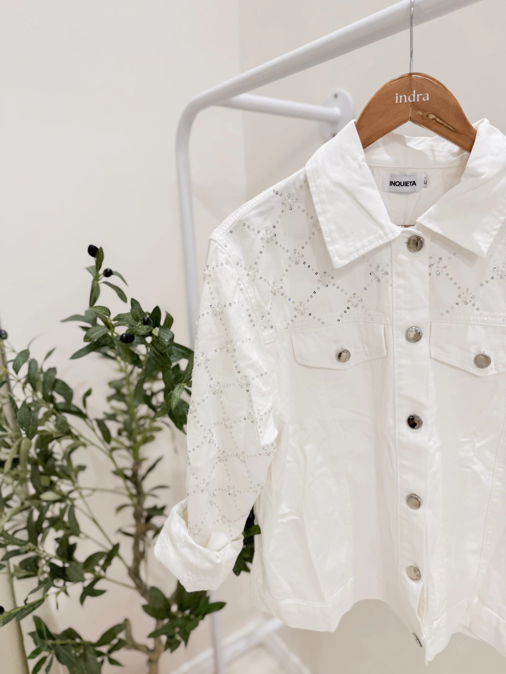 Campera de gabardina con detalle de lentejuelas y bordado en mangas y frente.