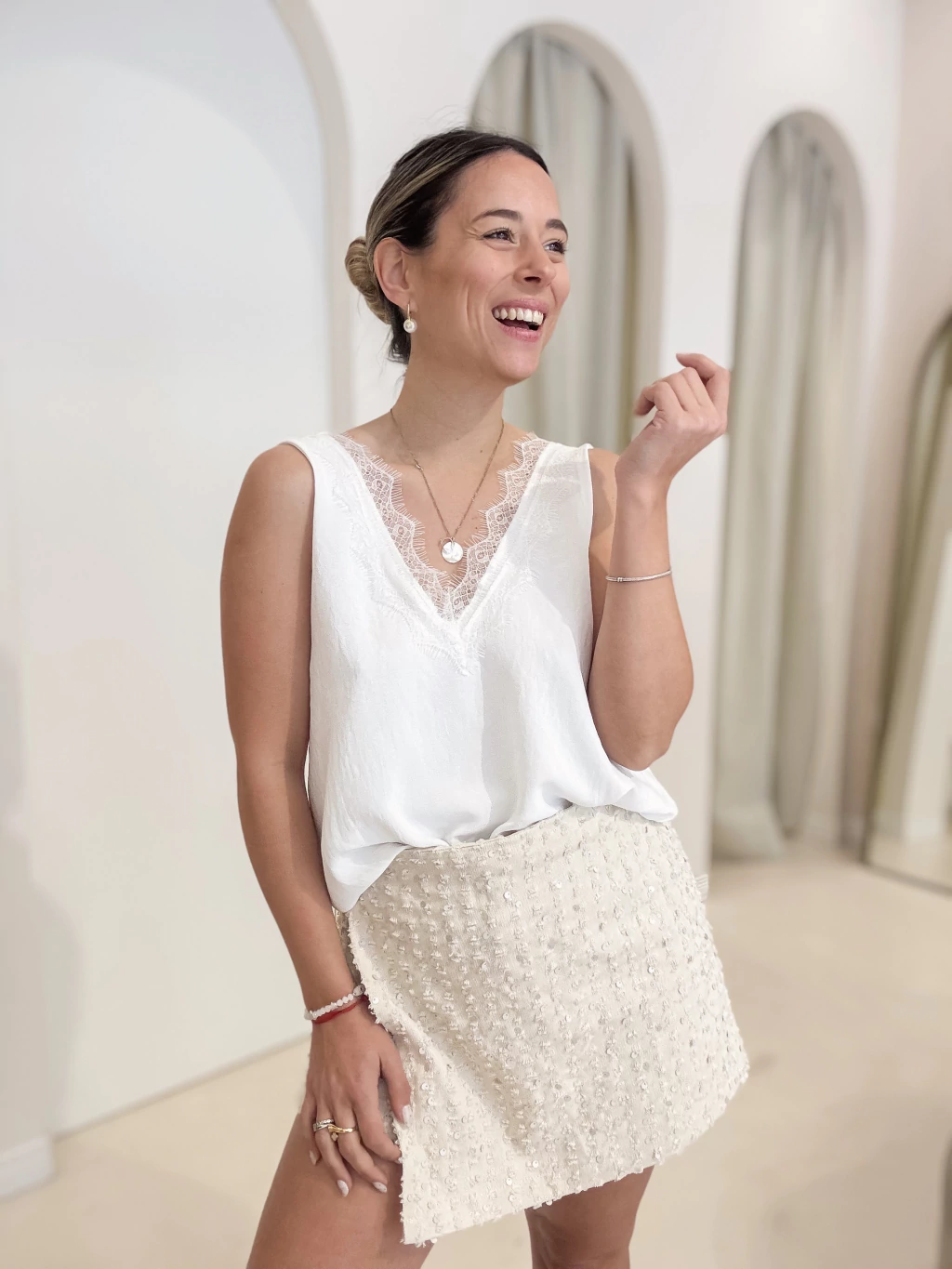 Musculosa basica escote v con detalle de encaje acompañando escote.
