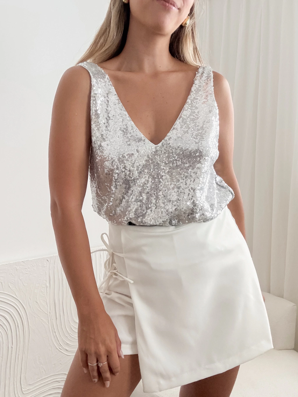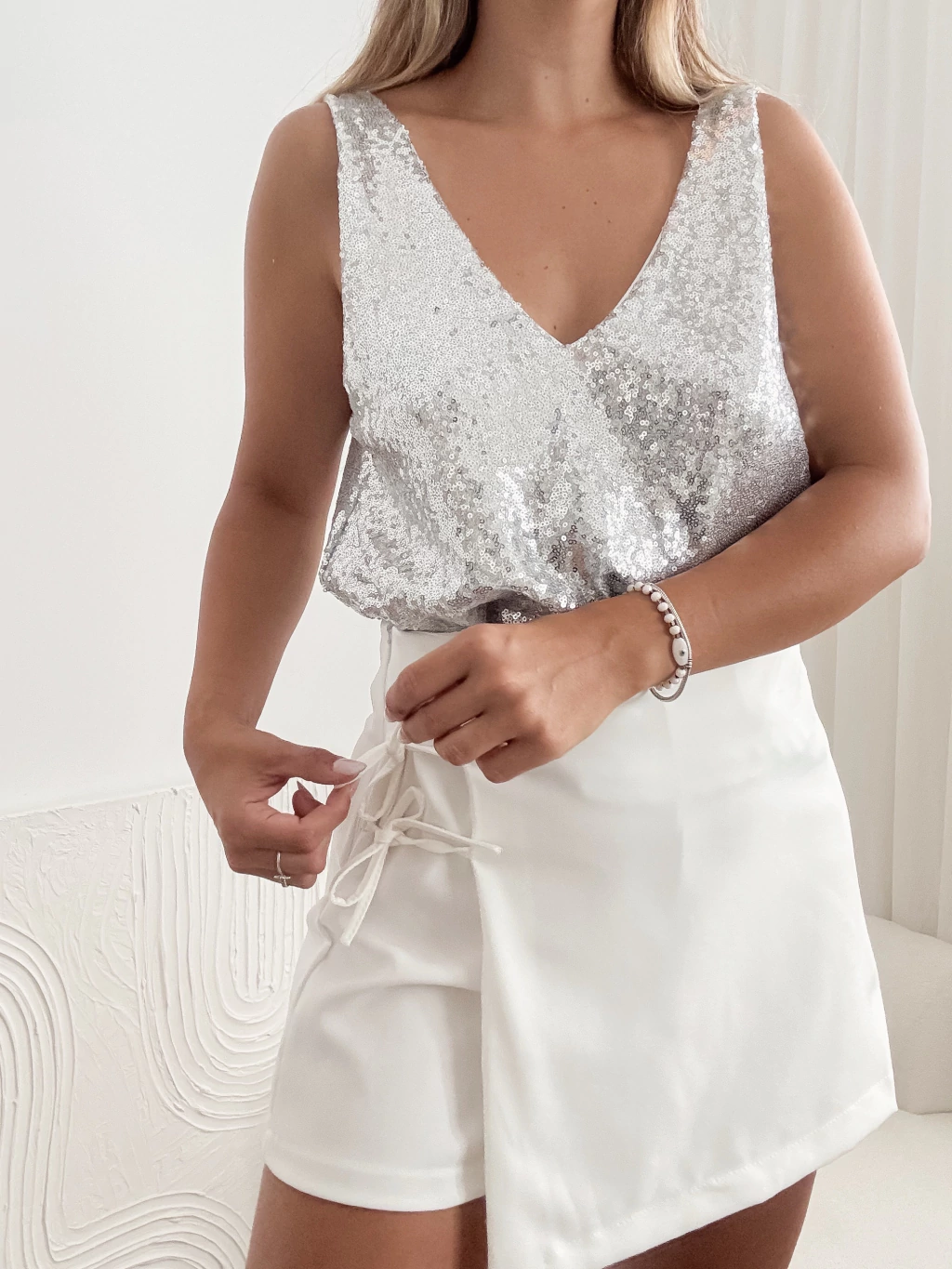 Skort de crep sastrero con tiritas para atar y cierre invisible en costado.